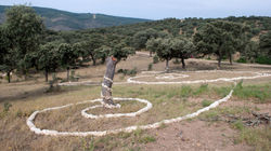 Los sacos de yute serían cosidos o anudados hasta un largo de 10 metros aproximadamente. El tapiz se tendería entre las encinas de manera que al final tendremos un rebaño más en la dehesa.